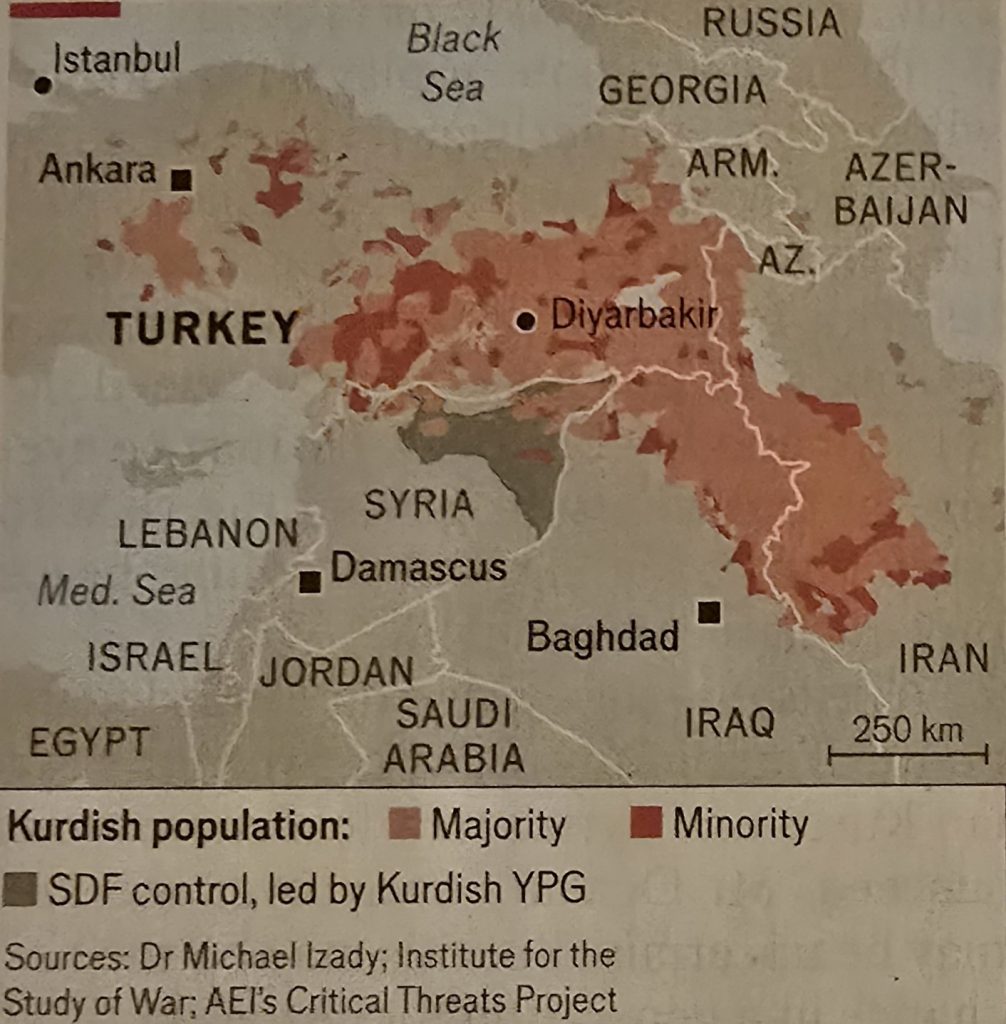 Al sur de todo esto está Siria, donde la caída del déspota Al Asad, favoreció que los kurdos pudieran dejar la lucha armada contra él y se sientan más dueños de su región allí, fronteriza con Irak y Turquía. Aun así, la situación de Siria preocupa, les cuesta avanzar hacia la democracia. El presidente actual, Ahmed al Sharaa, es el líder de la principal guerrilla que propició el cambio de régimen y parece querer imponer una nueva dictadura. Ha empezado a marginar grupos étnicos o religiosos con los que no sintoniza, como los drusos de regiones fronterizas con Israel. Ha servido de disculpa a los judíos para bombardear Siria y reforzar su presencia en los Altos del Golán.
