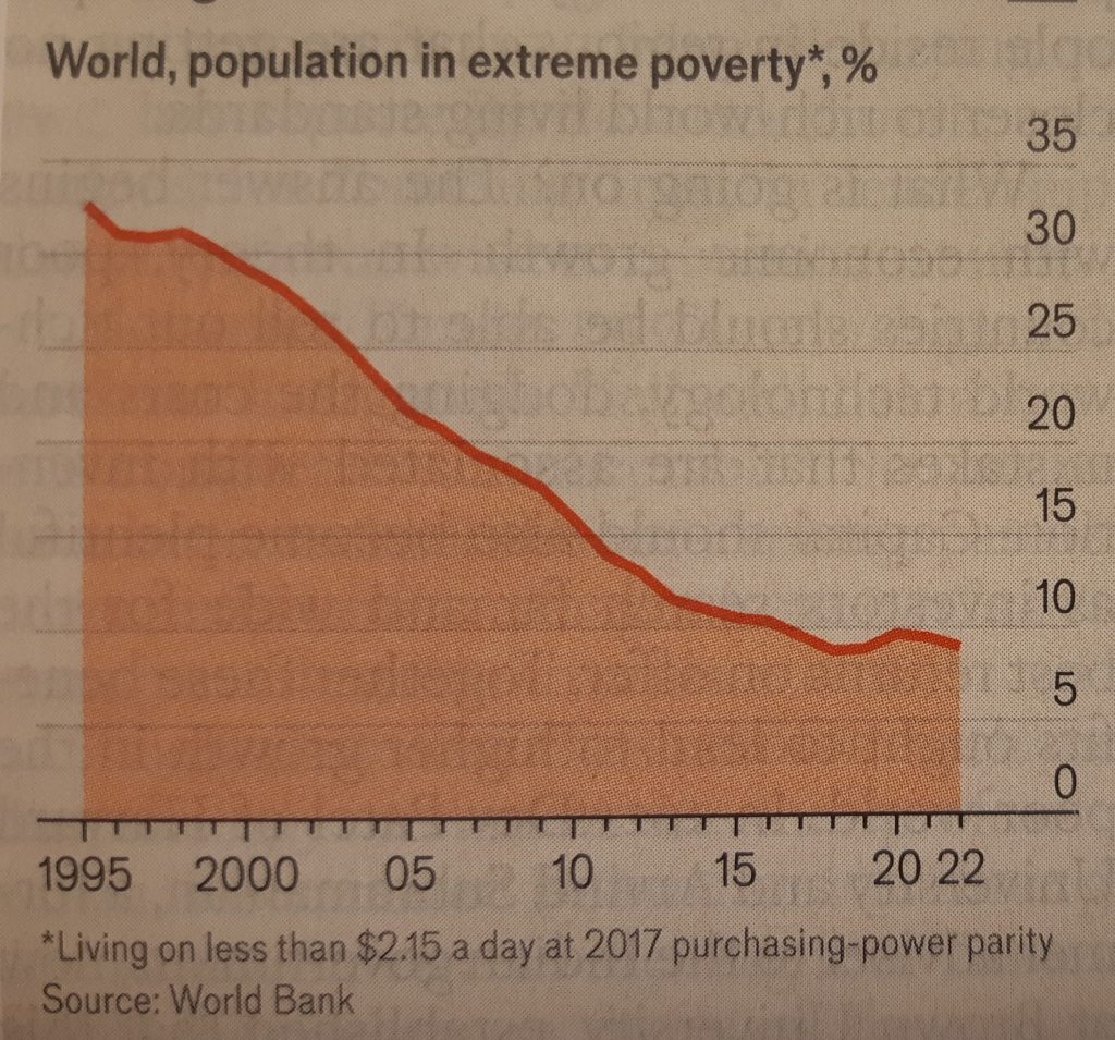 En su discurso ante la cumbre del G20 celebrada en noviembre en Río, nos recordaba el Presidente de Brasil, Lula da Silva, que hay 733 millones de personas que pasan hambre. Gente que no puede cubrir sus necesidades más básicas. Lo peor es que la cifra está estancada. Por primera vez desde la Revolución Industrial, durante los 20 años que siguieron a 1995, los países atrasados crecieron más que los más avanzados y el mundo caminó hacia una mayor equidad. La pobreza extrema cayó, desde un tercio de la población mundial, a menos de un 10%, como se puede ver en el gráfico del final, tomado de The Economist. Por mucho que digan los nostálgicos del comunismo, amigos más o menos explícitos de Vladimir Putin, la era de apertura económica posterior a la caída de la URSS funcionó. La globalización fue un éxito, en gran medida porque hubo menos conflictos armados y fue empujada por la liberalización de la economía china de la mano de Den Xiaoping, la eliminación de restricciones administrativas (license Raj) en la India y el acercamiento de los países del este de Europa a la UE.