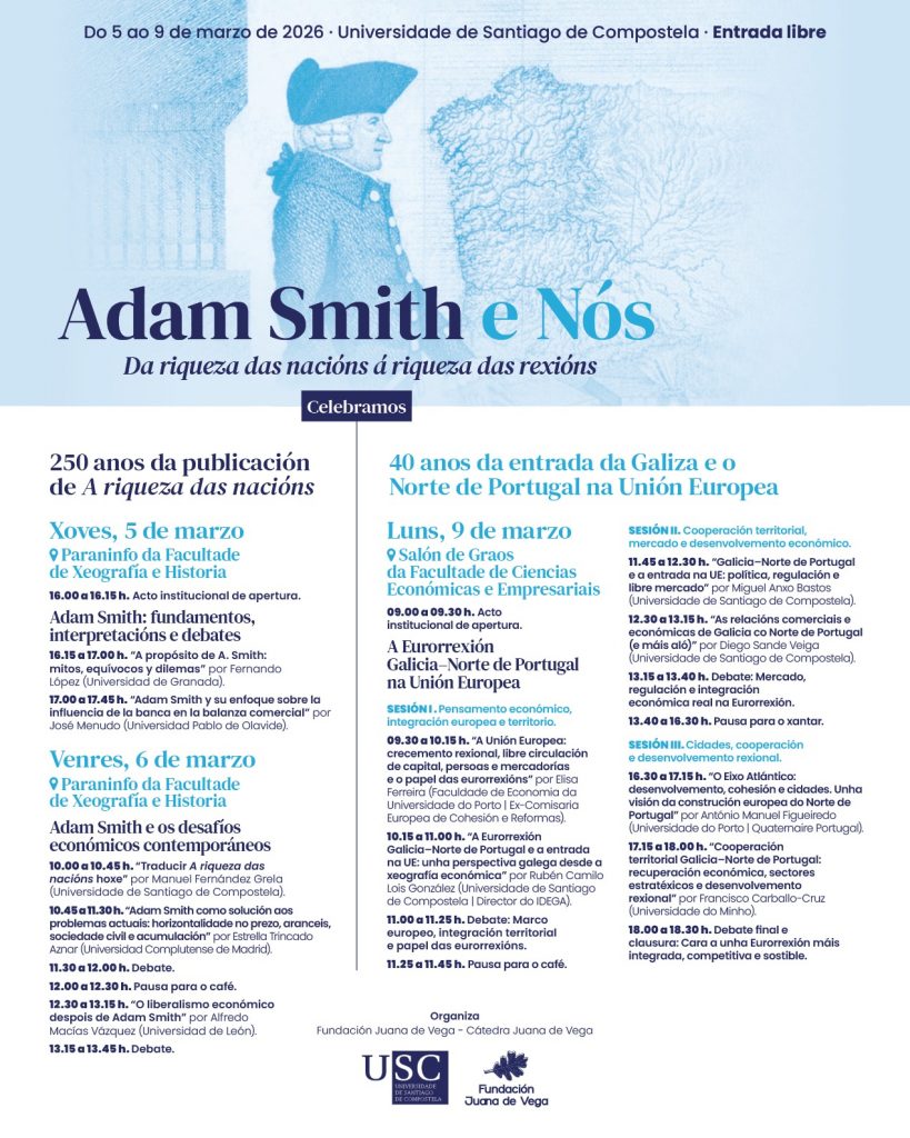 Cuando el mundo se vuelve a concentrar en unas pocas potencias y sus aliados, que disparan y matan sin atenerse a las leyes que regulan las relaciones humanas, es conveniente volver a reflexionar sobre las propuestas del Sr. Smith y verlas reflejadas en un caso concreto, que muestra el éxito de llevarlas a la práctica. Por eso, en los próximos días, relevantes profesores de España y Portugal se reunirán en Santiago (hoy día 5 por la tarde y mañana por la mañana) para analizar las ideas  del primer gran economista. La última jornada será el lunes 9, el día exacto que se cumple el aniversario referido antes. Se centrará en el caso de Galicia y el norte de Portugal. Desde que se eliminaron los aranceles entre ambas, crecen más que la media de sus respectivos países. Son el mejor ejemplo de integración económica transfronteriza en Europa, como recordó, más de una vez, Marcelo Rebelo de Sousa, el popular presidente de Portugal que deja su cargo ese mismo día. El mejor ejemplo de las ventajas de eliminar el arancel, elegido palabra del año 25 por la Real Academia Española