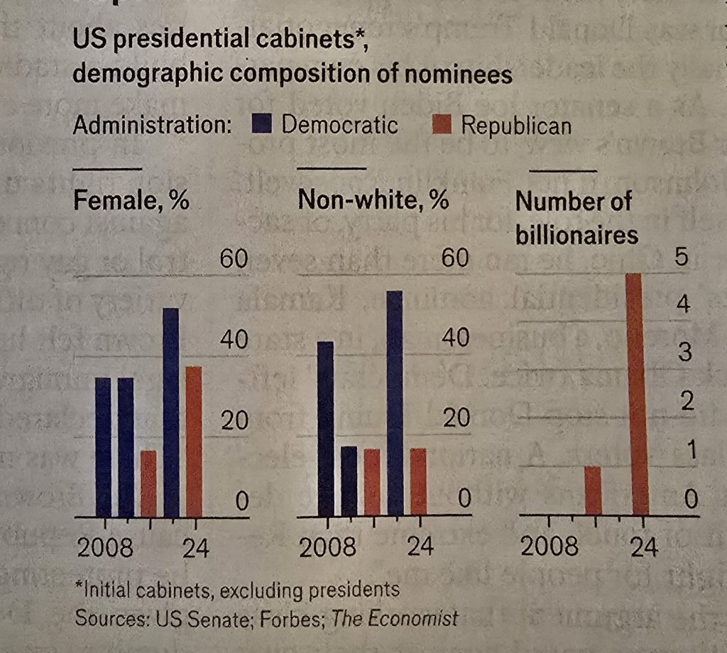 El sesgo de su gobierno, en línea con otros presidentes republicanos, se ve en el gráfico siguiente tomado de The Economist, el porcentaje de mujeres baja respecto al de Biden, el de miembros de razas no blancas se desploma y el número de mil millonarios (5) en el ejecutivo es récord histórico.