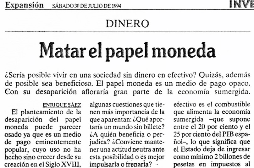 Hay ya países avanzados que han iniciado el camino que lleva a la desaparición del efectivo. En España, algunos analistas empiezan a darse cuenta del impacto de los medios de pago en el aumento del crecimiento y la recaudación (1). Pero les cuesta sacar conclusiones obvias. Presumo de detectar pronto algunas corrientes de fondo que nos afectan. El título elegido hoy es el mismo del artículo que publiqué en Expansión hace 30 años (30/07/94). El primero en Europa sobre una oportunidad histórica para mejorar el modo de vida que tenemos y aumentar la eficacia económica (el efectivo es un sistema de otro tiempo y tiene un tratamiento muy caro) que se va retrasando por la voluntaria desidia de los interesados en que las cosas sigan igual. Confío en que la presión de los jóvenes, que pagan todo con el móvil, acabe forzándonos a aprovechar las ventajas de la caída del efectivo que empezamos a ver. Estamos perdiendo demasiado tiempo, podemos vivir mejor todos, a cambio de que dejen de vivir bien muchos indeseables.