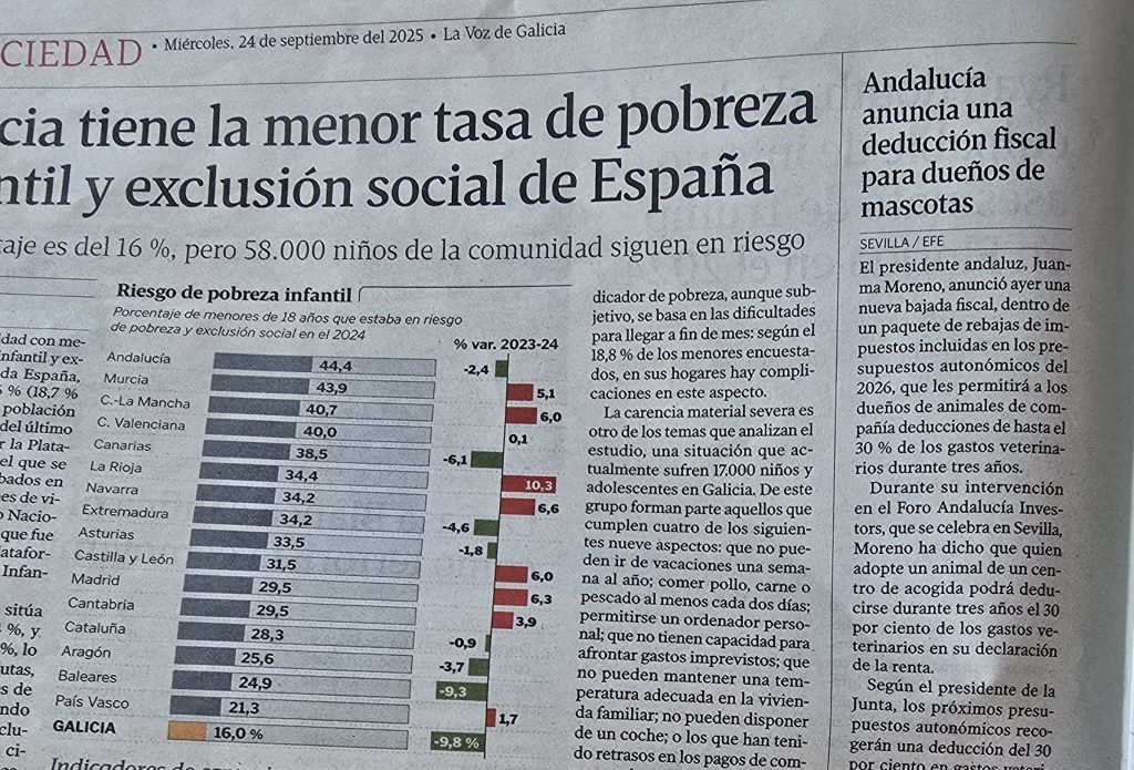 Leí la noticia de la ayuda a los propietarios de perros en Andalucía en La Voz de Galicia. Venía al lado de otra más destacada en que reflejaba que Galicia era la comunidad con menor riesgo de pobreza infantil, reproduzco parte de la página al final. No sé si fue casualidad o mala leche del redactor que compuso la página, pero en la estadística de ese riesgo por CCAA que allí se recogía, la peor era Andalucía. Me dio qué pensar ver juntas una grave realidad y una acción política que resta medios para combatirla. El gobierno de la comunidad con más problemas de pobreza se dedica a dar ventajas fiscales, por razones electoralistas, a los dueños de mascotas que no suelen coincidir con aquellos a los que les cuesta alimentar a sus hijos.