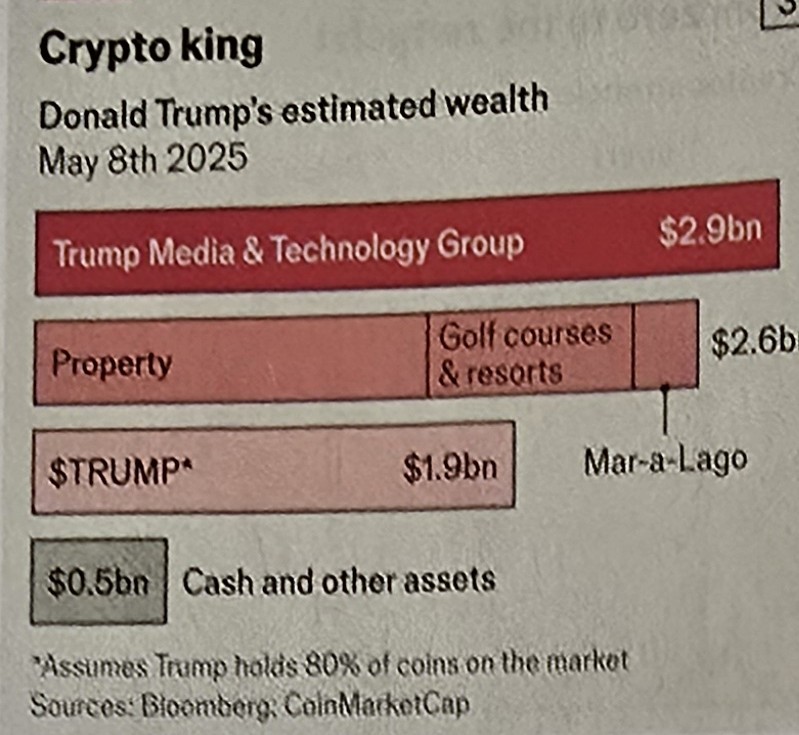 Trump está influido por un grupo elitista, que se reúne en Mar A Lago, del que recluta ideas y ejecutivos, como su Secretario de Estado, Marco Rubio ex gobernador de Florida, o Elon Musk que seguirá influyendo, aún después de salir corriendo de la Casa Blanca por las pérdidas en sus negocios. La hiperactividad presidencial se refuerza por las ganas de actuar pronto, ya que no podrá ser reelegido. Lo mismo se mete con la más prestigiosa universidad del mundo, que organiza una reunión para vender sus criptomonedas, activo de inversión volátil del que se ha hecho comerciante, como su amigo Milei en Argentina. Una legislación amigable y las ayudas de los ricos, generan ahora criptocracias. En el gráfico se aprecia el gran peso (1.900 millones de dólares) que la cripto ($ Trump) tiene en el conjunto de sus recursos . Mientras, la economía del país se deteriora, también a largo plazo por su empeño en expulsar extranjeros, aunque sean estudiantes destacados. El medio ambiente sufre por su tolerancia con el petróleo, tendrán tornados más desbastadores.