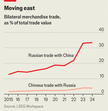 Aún así, el mandamás chino se apoya en el control de materias primas estratégicas, las ayudas a países en vías de desarrollo y su importante posición en nuevas tecnologías. Por ejemplo, han desarrollado su propio sistema de posicionamiento global (Bei Dou) mucho más resistente que el extendido GPS. Ahora, aprovecha el conflicto de Ucrania para manejar a Putin y ayudarle a debilitar los países europeos que asisten al invadido. A pesar de los cariños que se tienen Donald y Vladimir, éste no va a parar hasta dominar toda Ucrania (entrada de este blog, del pasado 21/3: Someter a Putin). Putin seguirá agrediendo mientras Xi se lo permita, lo tiene cogido por sus partes, depende de que el gran vecino le siga comprando materias primas, sobre todo, petróleo. En este segundo gráfico, de la misma fuente (The Economist), se ve la enorme dependencia rusa del comercio con China.